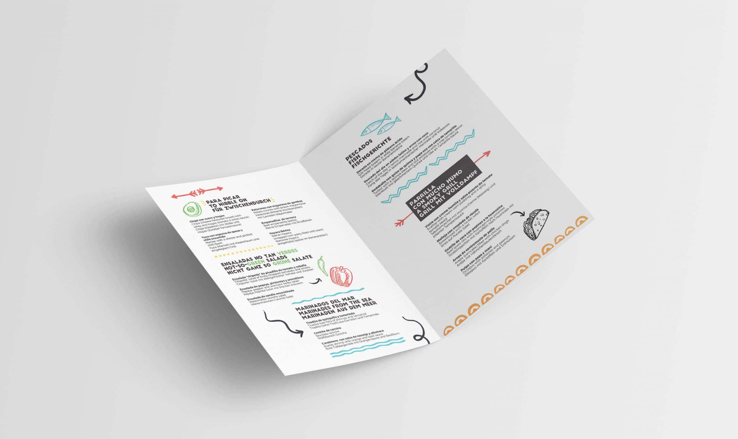 En el primer paso en el proceso de diseño de logotipo para restaurante, se aboga por el uso de una gama cromática amplia y cálida donde predominen los colores que se empleen tanto en los platos más típicos de la gastronomía sudamericana así como en la propia naturaleza latina dando como resultado una paleta cromática definida que se conjuga en tintes que recuerdan a los colores de la comida, como a la decoración tradicional latina como los colores propios de un atardecer.