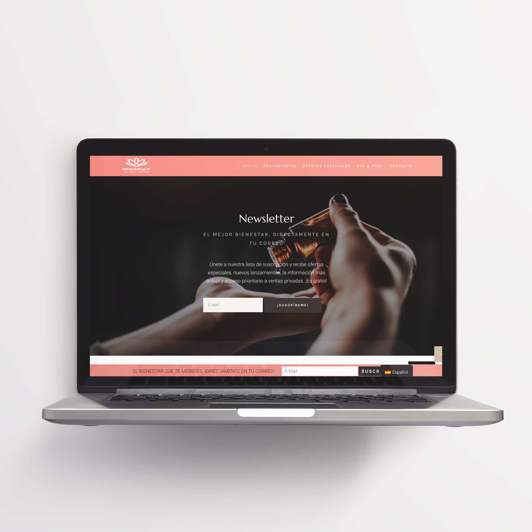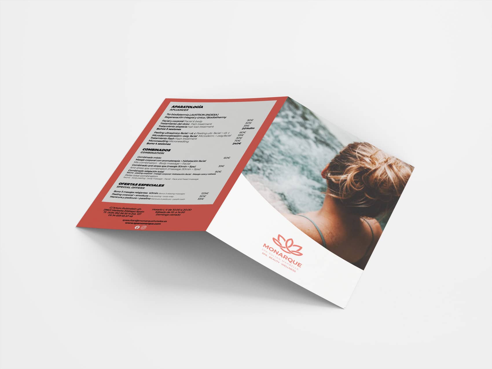 Finalmente, se define una configuración visual en el que los grosores y pesos de las tipografías ayudan a definir el recorrido visual de la marca creando un conjunto equilibrado y estable. Principios y valores que se comunican a través del resto de materiales gráficos y que se hacen aún más visibles en el diseño web de Monarque Spa en el que los elementos visuales se agrupan en cajas y espacios modulares que buscan la mayor estabilidad visual.